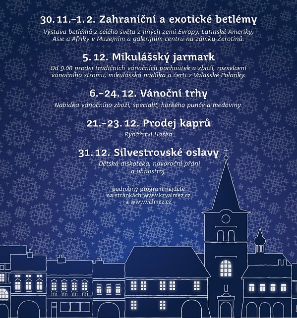 V sobotu 6. prosince odstartují na náměstí oblíbené Vánoční trhy, které potrvají až do Štědrého dne. Těšit se navíc můžete i na bohatý odpolední kulturní program. Vedle vystoupení dětí z mateřských a základních škol se můžete těšit například na koncerty, během kterých vystoupí Leona Machálková, Děda Mládek Illegal Band, Pokáč, Olga Lounová, Rock&Roll Band Marcela Woodmana a další. Chybět nebude ani oblíbená akce Česko zpívá koledy nebo vystoupení místního Valašského souboru písní a tanců Bača za doprovodu Cimbálové muziky Polajka.